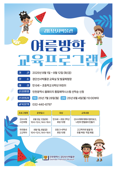 이번 여름방학 교육은 6세부터 초등학교 6학년까지 무료로 참여할 수 있으며, ‘선사시대 시간여행’은 화요일, ‘우리동네 고고학자’는 금요일에 각각 오전과 오후 2회차로 운영된다.