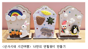 ‘선사시대 시간여행’은 6세부터 초등학교 2학년 어린이를 대상으로 한 교육프로그램으로, 선사시대에 대해 알아보고 나만의 연필꽂이를 만드는 체험이다.
