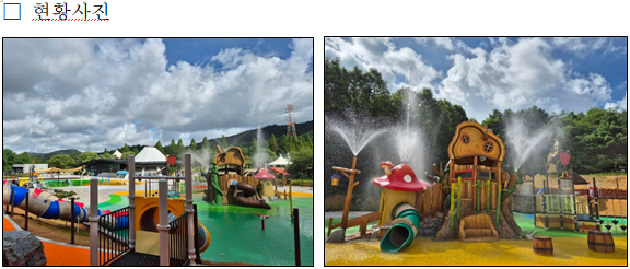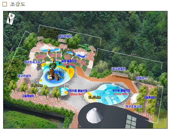물놀이장은 약 38억 원을 투자해 총면적 3,930㎡ 규모로 조성했으며, 어린이·유아용 물놀이장, 워터슬라이드, 샤워시설, 탈의실, 휴게음식점 등 다양한 편의시설을 갖추고 있다. 수심은 어린이의 안전을 고려해 25㎝를 넘지 않도록 설계했다.